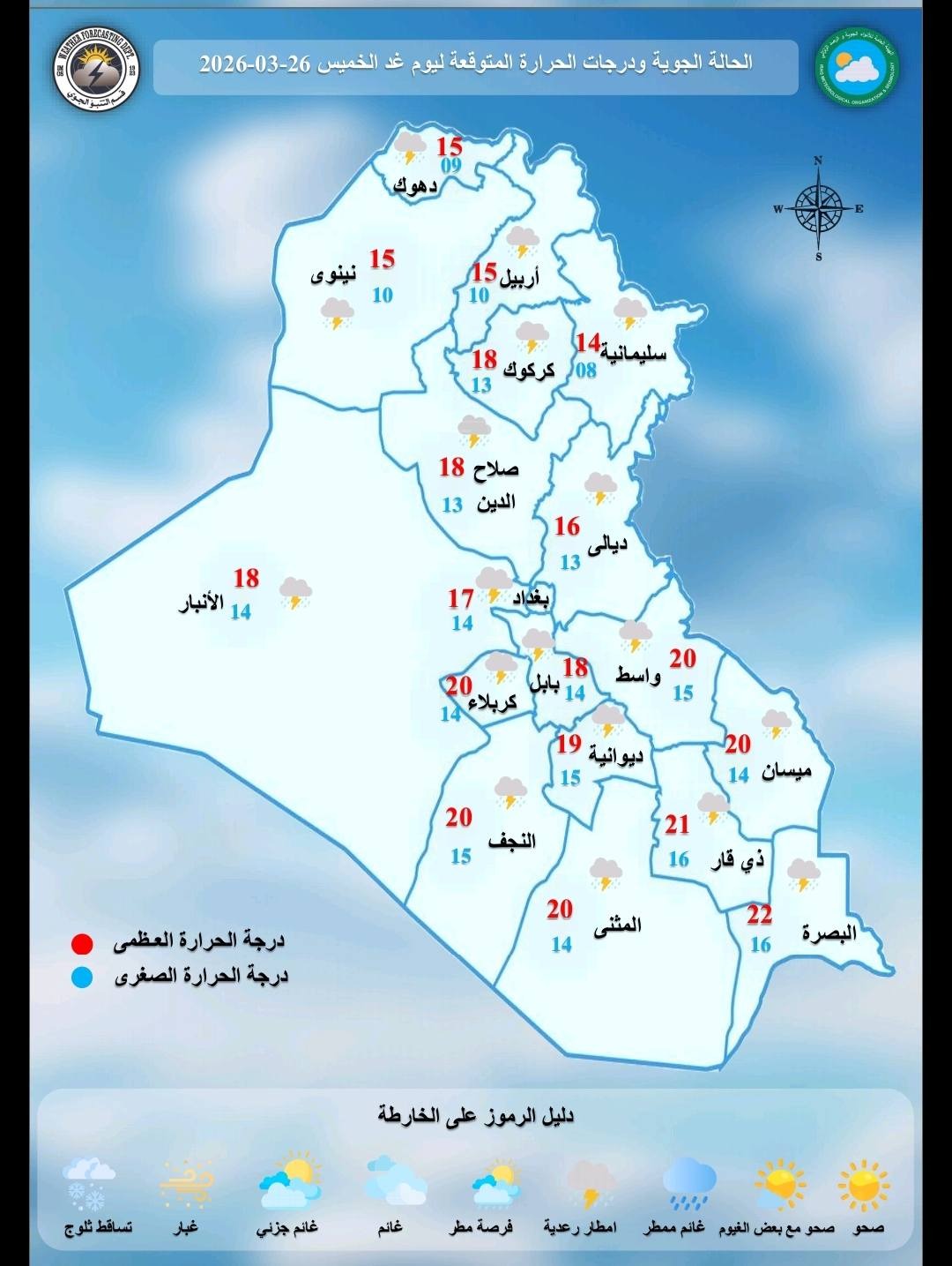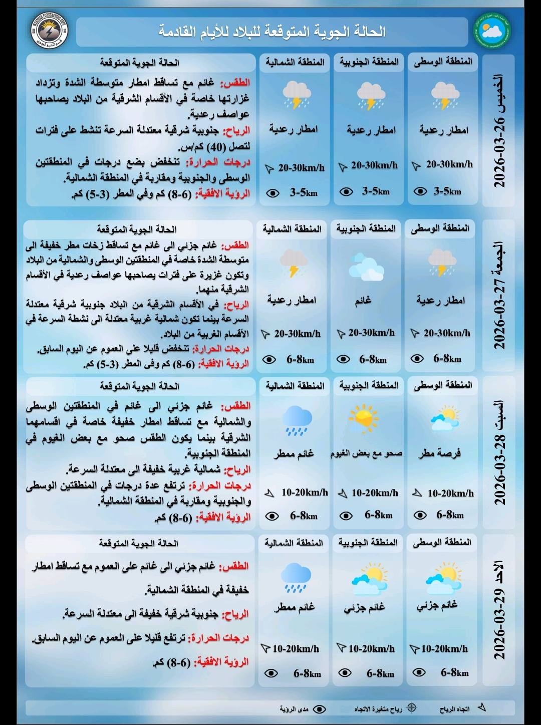 ، أن "غدا الخميس سيكون الطقس غائم مع تساقط امطار متوسطة الشدة وتزداد غزارتها خاصة في الاقسام الشرقية من البلاد يصاحبها عواصف رعدية، ودرجات الحرارة تنخفض بضع درجات في المنطقتين الوسطى والجنوبية ومقاربة في