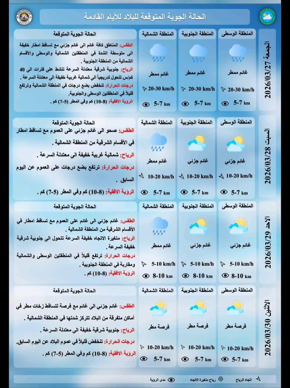 وترتفع قليلاً في المنطقتين الوسطى والجنوبية"، مبينة ان "طقس يوم السبت المقبل سيكون صحوا إلى غائم جزئي على العموم مع تساقط امطار في الأقسام الشرقية من المنطقة الشمالية ودرجات الحرارة ترتفع بضع درجات على العموم عن اليوم السابق".