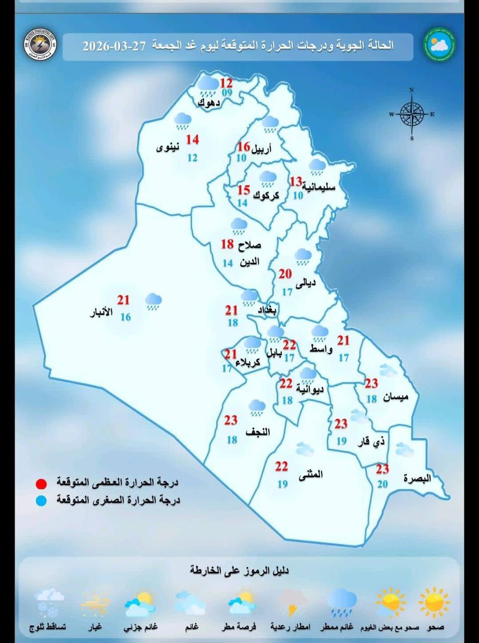 ، ان "طقس يوم غد الجمعة سيكون غائما الى غائم جزئي مع تساقط امطار خفيفة الى متوسطة الشدة في المنطقتين الشمالية والوسطى والأقسام الشمالية من