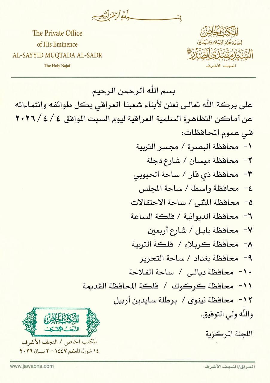 اللجنة المركزية في مكتب السيد الصدر تحدد اماكن إقامة التظاهرات في المحافظات
