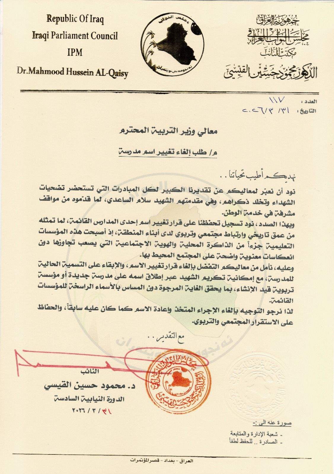 رئيس كتلة العزم يطالب بإلغاء قرار تغيير اسم إحدى المدارس