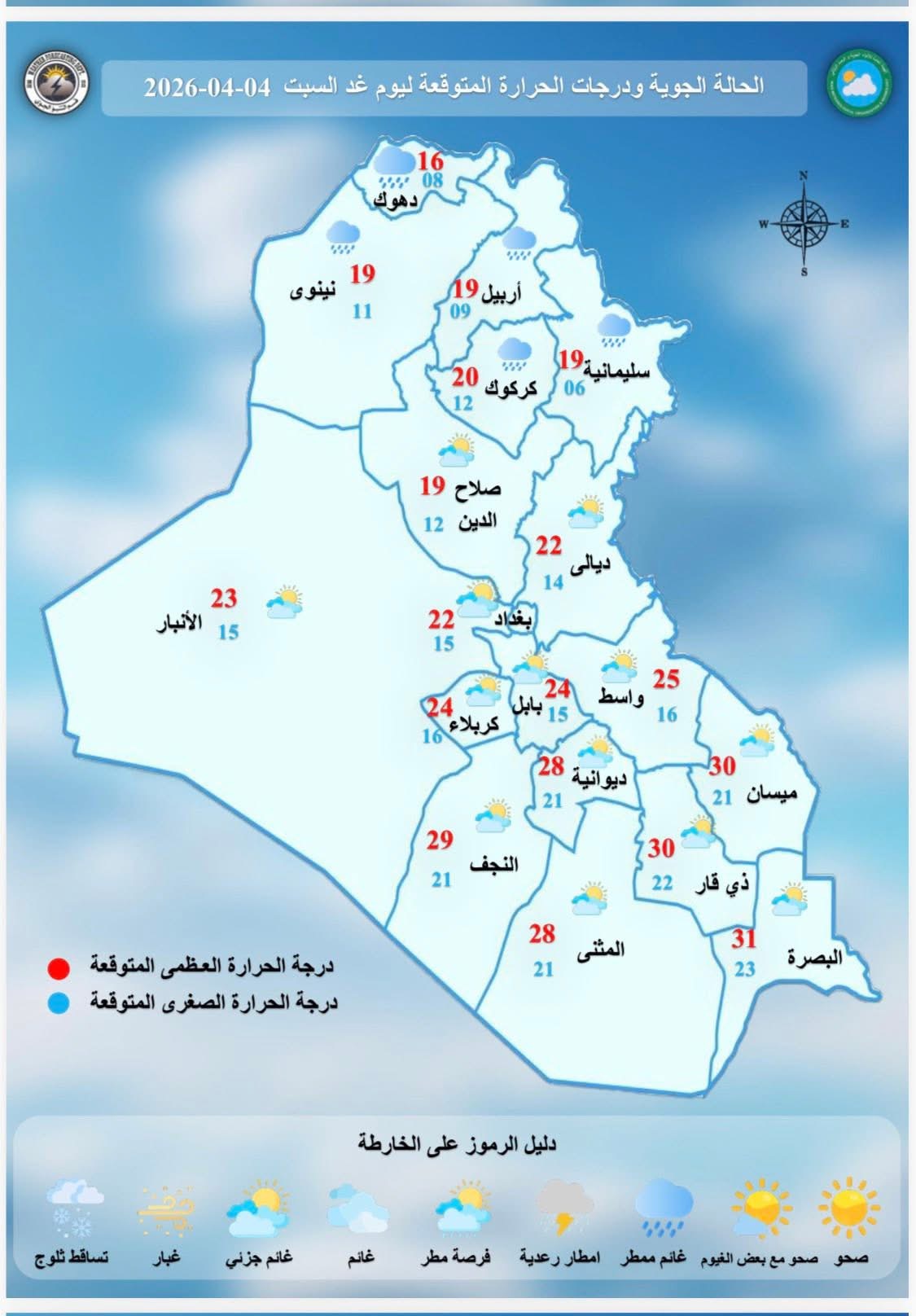 ، ان "طقس يوم غد السبت سيكون غائما جزئيا الى غائم مع تساقط امطار خفيفة الى متوسطة الشدة في