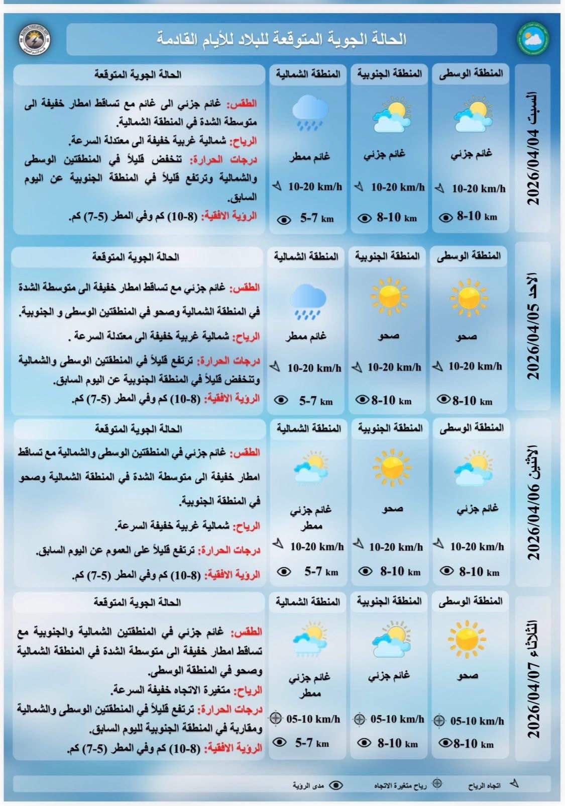 السابق"، مبينة ان "طقس يوم الاحد المقبل سيكون غائما جزئيا مع تساقط امطار خفيفة الى متوسطة الشدة في المنطقة الشمالية وصحو في المنطقتين الوسطى والجنوبية ودرجات الحرارة ترتفع قليلاً في المنطقتين الوسطى والشمالية