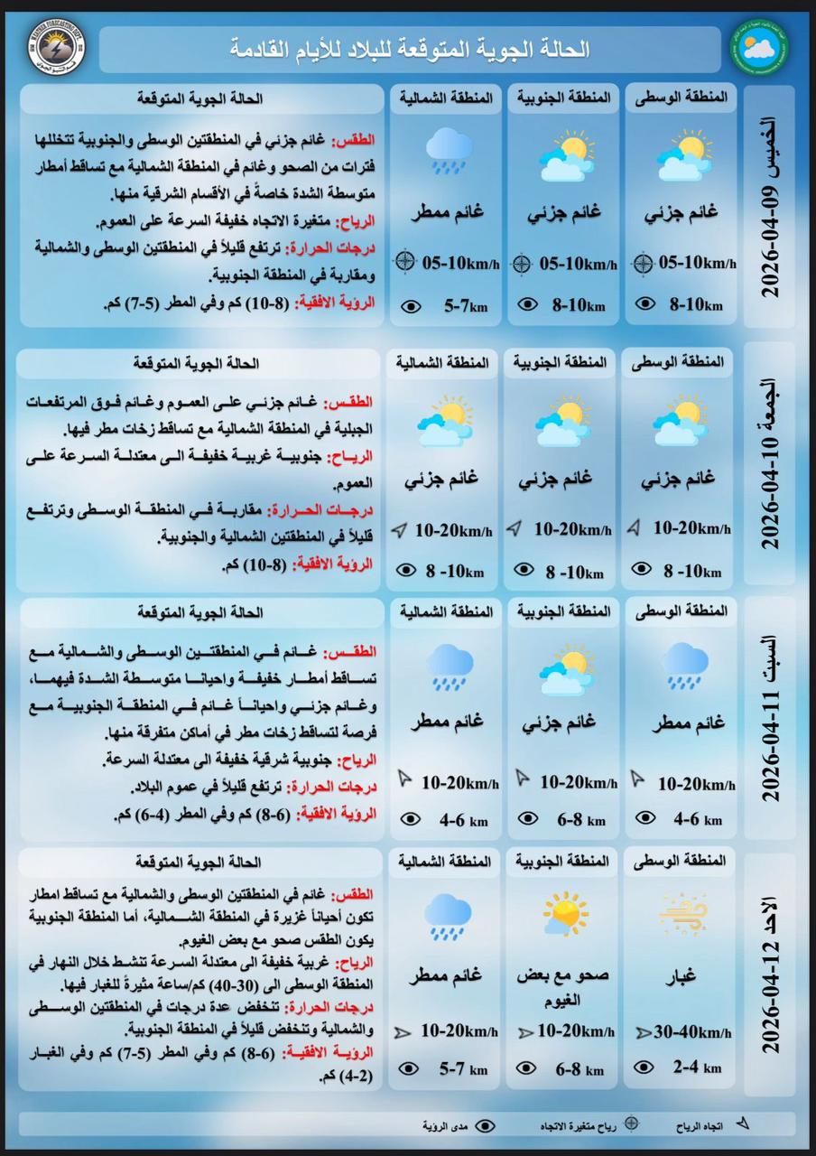 واضافت ان "طقس يوم السبت المقبل سيكون غائما في المنطقتين الوسطى والشمالية مع تساقط أمطار خفيفة واحيانا متوسطة الشدة فيهما وغائم جزئي واحياناً غائم في المنطقة الجنوبية مع فرصة لتساقط زخات مطر في أماكن متفرقة منها ودرجات الحرارة ترتفع قليلاً في عموم البلاد"، مشيرة الى ان "طقس يوم الاحد المقبل سيكون غائما في المنطقتين الوسطى والشمالية مع تساقط امطار تكون أحياناً غزيرة في المنطقة الشمالية، أما المنطقة الجنوبية يكون الطقس صحو مع بعض الغيوم وتصاعد للغبار في المنطقة الوسطى ودرجات الحرارة تنخفض عدة درجات في المنطقتين الوسطى والشمالية وتنخفض قليلاً في المنطقة الجنوبية".