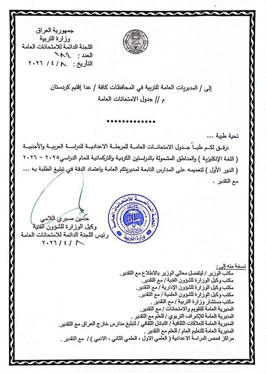 جدول الامتحانات العامة للمرحلة الإعدادية للدراسة العربية والأجنبية (اللغة الإنكليزية)، والمناطق المشمولة بالدراستين الكردية والتركمانية للعام الدراسي ٢٠٢٥–٢٠٢٦ (الدور الأول)، مؤكدًا ضرورة تبليغ الطلبة بالمواعيد بدقة".