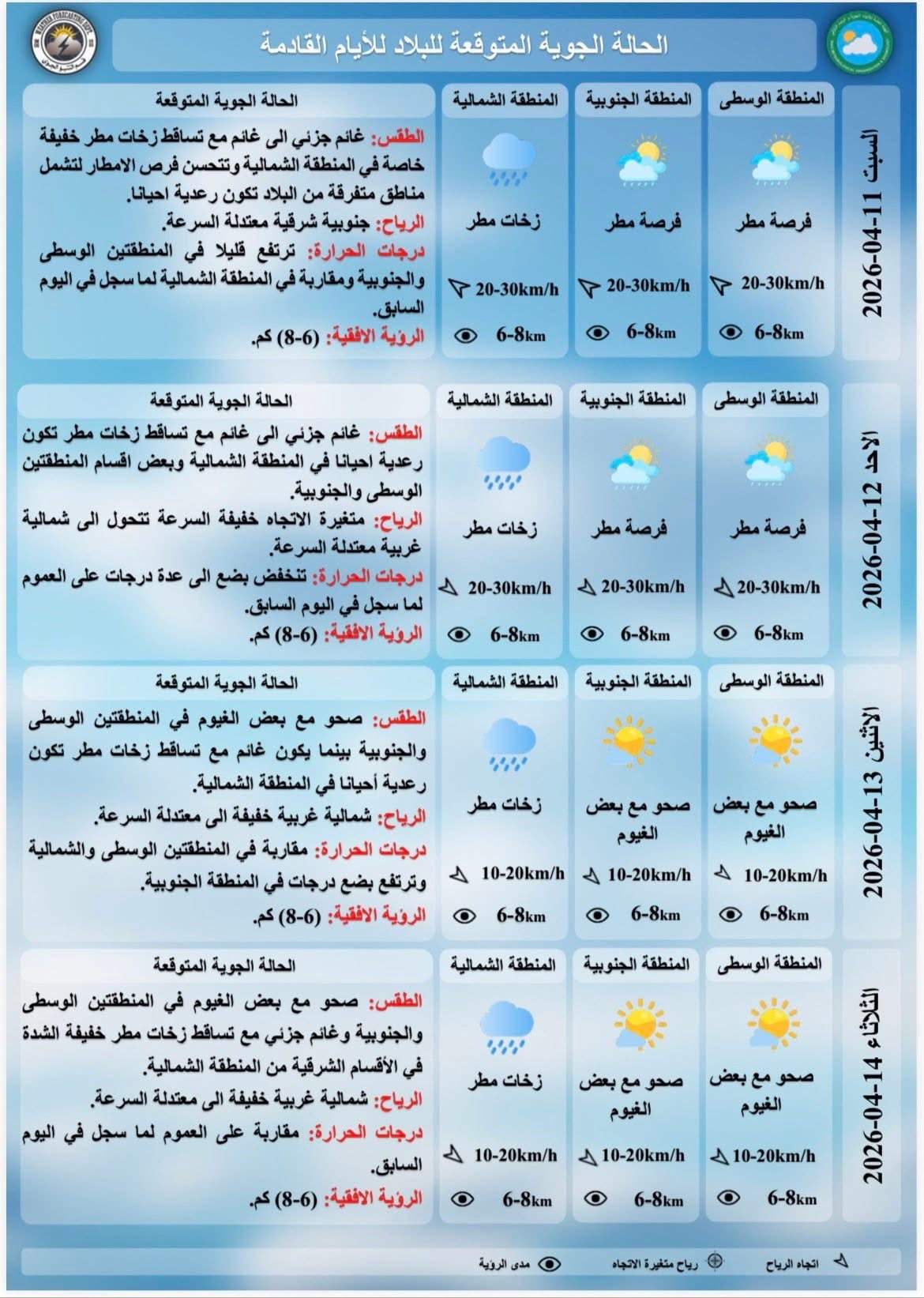 وتتحسن فرص الأمطار لتشمل مناطق متفرقة من البلاد وتكون رعدية احياناً، ودرجات الحرارة ترتفع قليلاً في المنطقتين الوسطى والجنوبية ومقاربة في المنطقة الشمالية عن اليوم السابق".