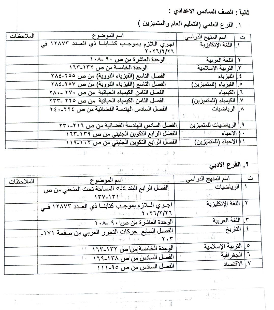 جداول جديدة لتعليق بعض الموضوعات من المناهج الدراسية للعام الدراسي الحالي