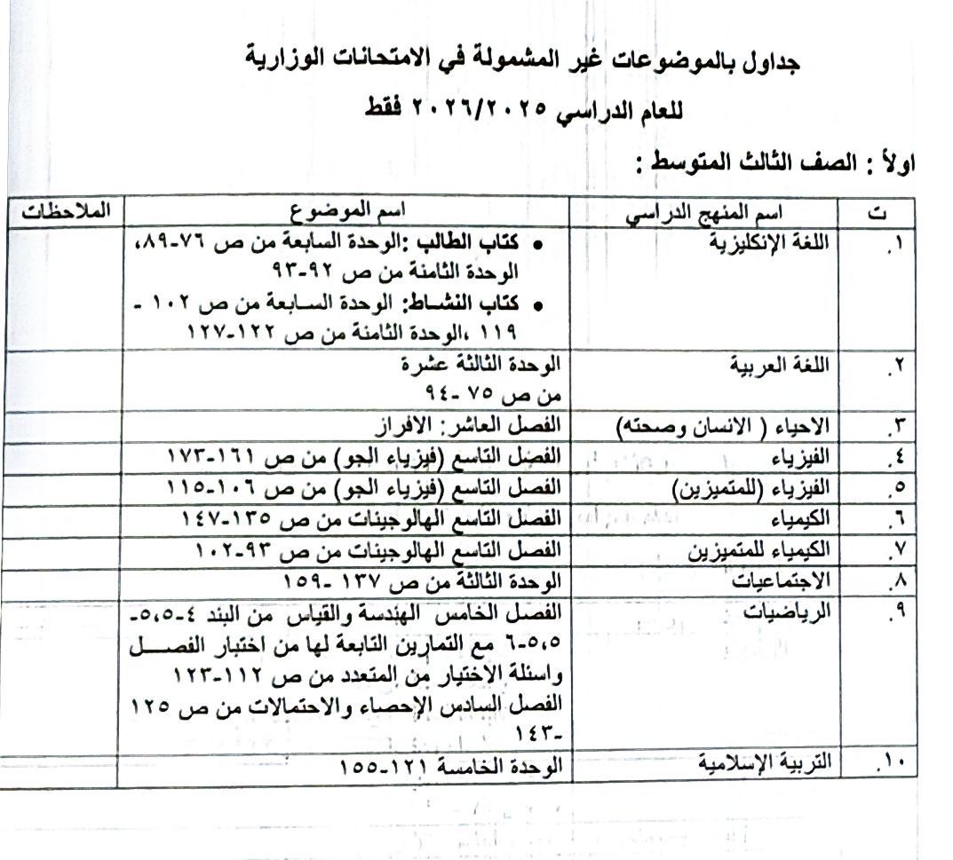 التربية تعلن جداول الموضوعات غير المشمولة بالامتحانات الوزارية