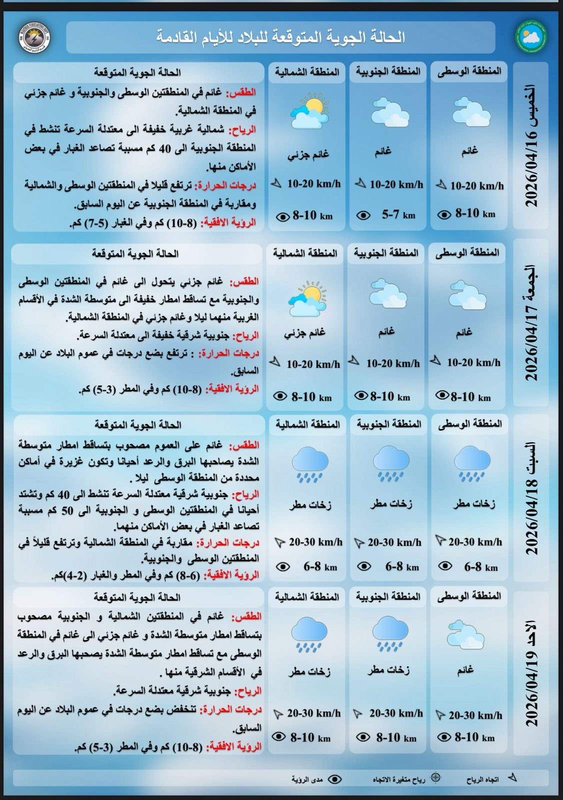 وذكر أن "الأحد القادم سيكون الطقس غائماً في المنطقتين الشمالية والجنوبية مصحوب بتساقط أمطار متوسطة الشدة، وغائماً جزئياً إلى غائم في المنطقة الوسطى مع تساقط أمطار متوسطة الشدة يصحبها البرق والرعد في الأقسام الشرقية منها، ودرجات الحرارة تنخفض بضع درجات في عموم البلاد عن اليوم السابق".