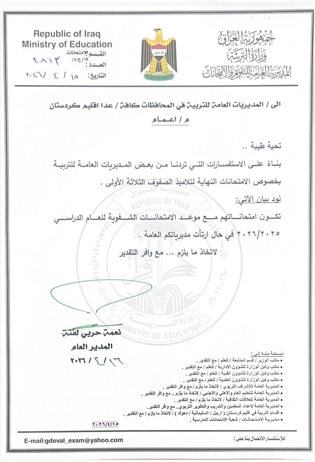توجيه من التربية يخص اسئلة الامتحانات النهائية