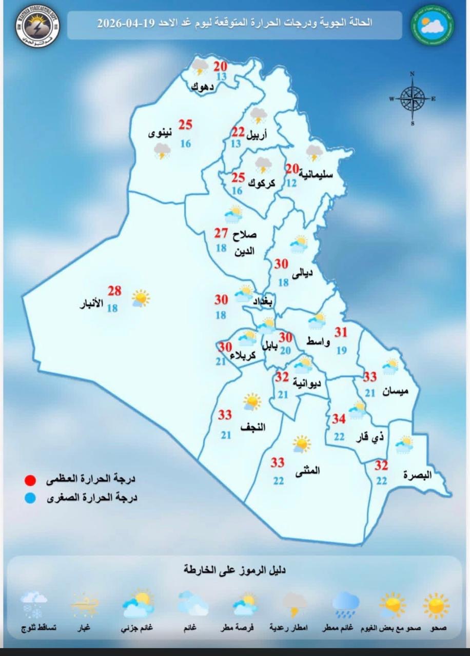 وتابعت ان "درجات الحرارة العظمى ليوم غد الاحد في المنطقة الجنوبية ستتراوح بين (32-34) وفي المنطقة الوسطى بين (27-30)، وفي المنطقة الشمالية بين (20-27)".