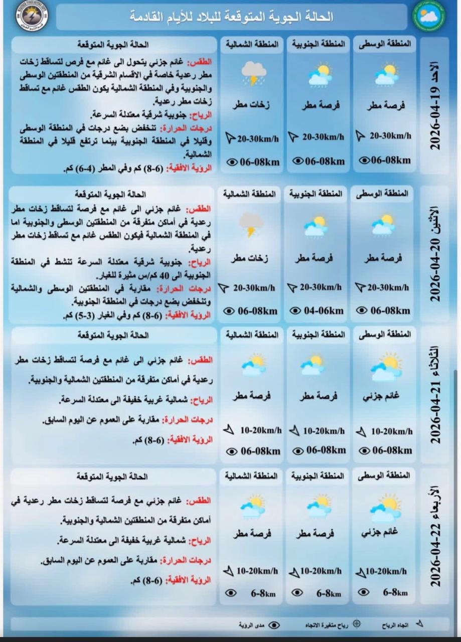 يكون الطقس غائماً مع تساقط زخات مطر رعدية، ودرجات الحرارة تنخفض في المنطقتين الوسطى والجنوبية بينما ترتفع قليلاً في المنطقة الشمالية".