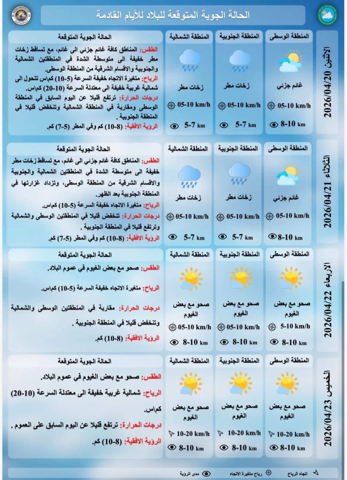 ، ان "طقس يوم غد الإثنين سيكون الطقس غائماً جزئياً إلى غائم في المناطق كافة، مع تساقط زخات مطر خفيفة إلى متوسطة الشدة في المنطقتين الشمالية والجنوبية والأقسام الشرقية من المنطقة الوسطى، ودرجات الحرارة ترتفع قليلاً عن اليوم السابق في المنطقة الوسطى ومقاربة في