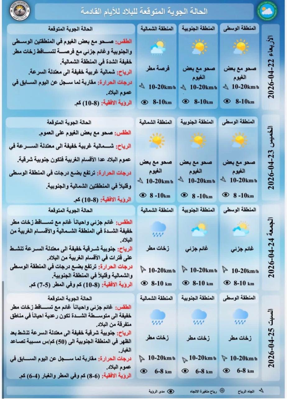 ، ان "طقس يوم غد الأربعاء سيكون صحواً مع بعض الغيوم في المنطقتين الوسطى والجنوبية، وغائماً جزئياً مع فرصة لتساقط زخات مطر خفيفة الشدة في