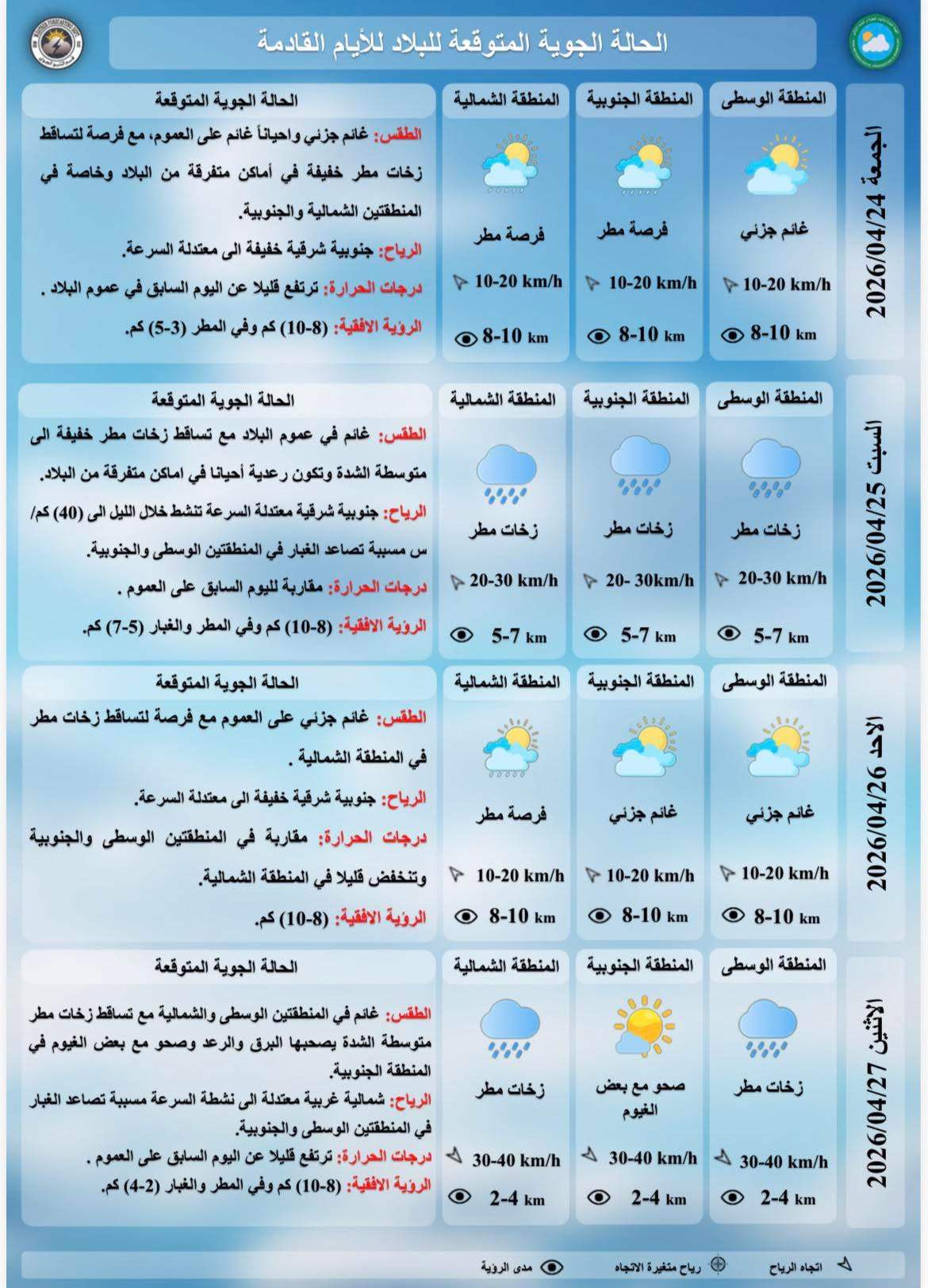 ، ان "طقس يوم غد الجمعة سيكون غائماً جزئياً واحياناً غائم على العموم، مع فرصة لتساقط زخات مطر خفيفة في أماكن متفرقة من البلاد وخاصة في المنطقتين الشمالية والجنوبية، ودرجات الحرارة ترتفع قليلا عن اليوم السابق في عموم البلاد"، مبينة ان "طقس يوم السبت المقبل سيكون غائم في عموم البلاد مع تساقط زخات مطر خفيفة الى متوسطة الشدة وتكون رعدية أحيانا في اماكن متفرقة من البلاد، والرياح جنوبية شرقية معتدلة السرعة تنشط خلال الليل مسببة تصاعد الغبار في المنطقتين الوسطى والجنوبية ودرجات الحرارة مقاربة لليوم السابق على العموم".
