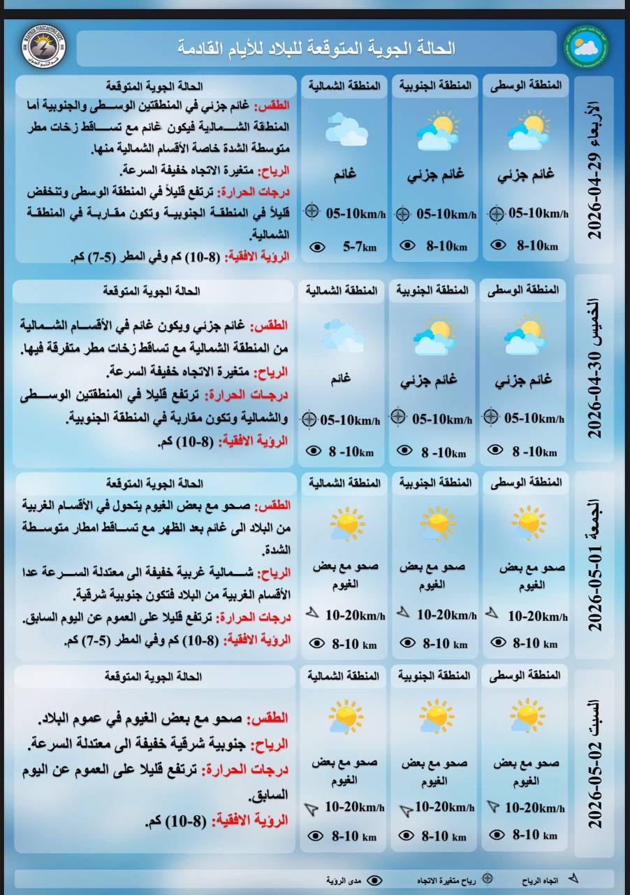 ، ان "طقس يوم غد الأربعاء سيكون غائماً جزئياً في المنطقتين الوسطى والجنوبية أما