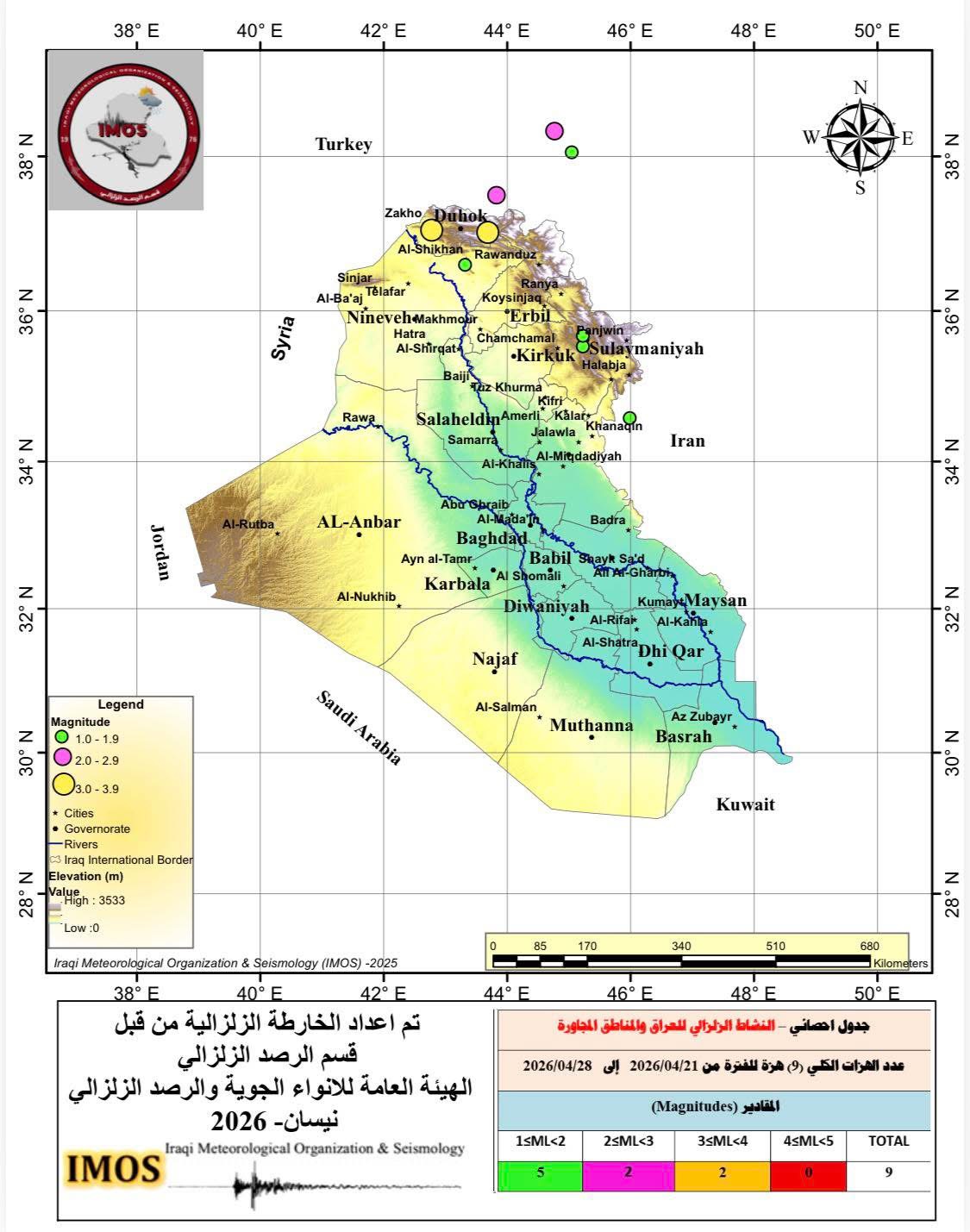 ، انه "تم تسجيل 9 هزات أرضية 5 منها في الاراضي العراقية".