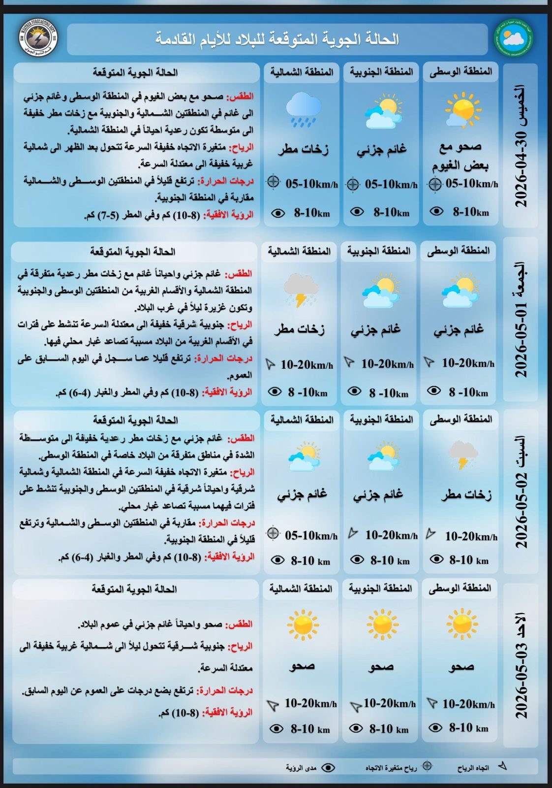 ، أن "غداً الخميس سيكون الطقس صحواً مع بعض الغيوم في المنطقة الوسطى، وغائماً جزئياً إلى غائم في المنطقتين الشمالية والجنوبية مع زخات مطر خفيفة إلى متوسطة تكون رعدية أحيانا في