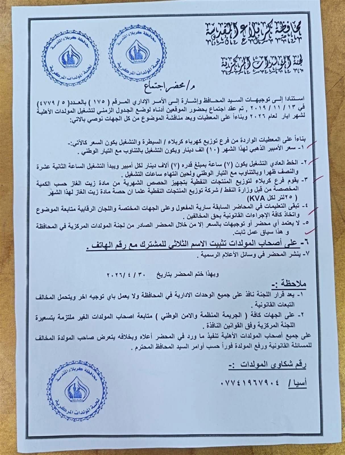 كربلاء تحدد تسعيرة الأمبير لهذا الشهر