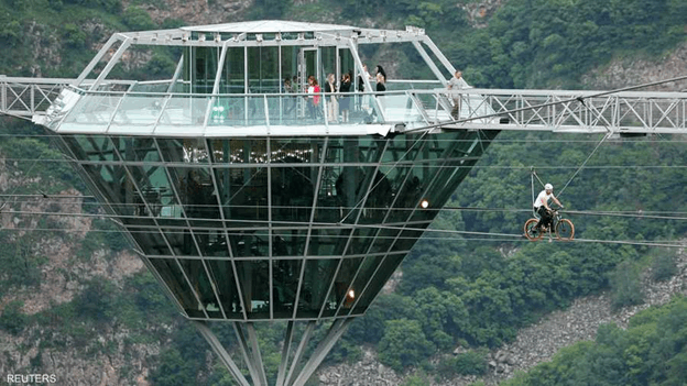 ووصُنعت أرضية الجسر من الزجاج الفرنسي المقسّى ويمكن أن يتحمل نحو 450 شخصاً في الوقت نفسه كما ترون في الصورة أدناه.