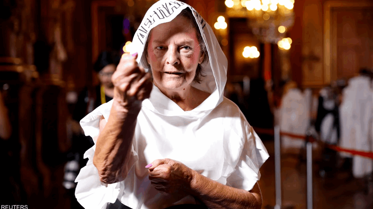 يدا بيد وبأزياء بيضاء بأحدث التصميمات سارت عارضات عجائز مع طلاب يدرسون الموضة في عرض غير اعتيادي في