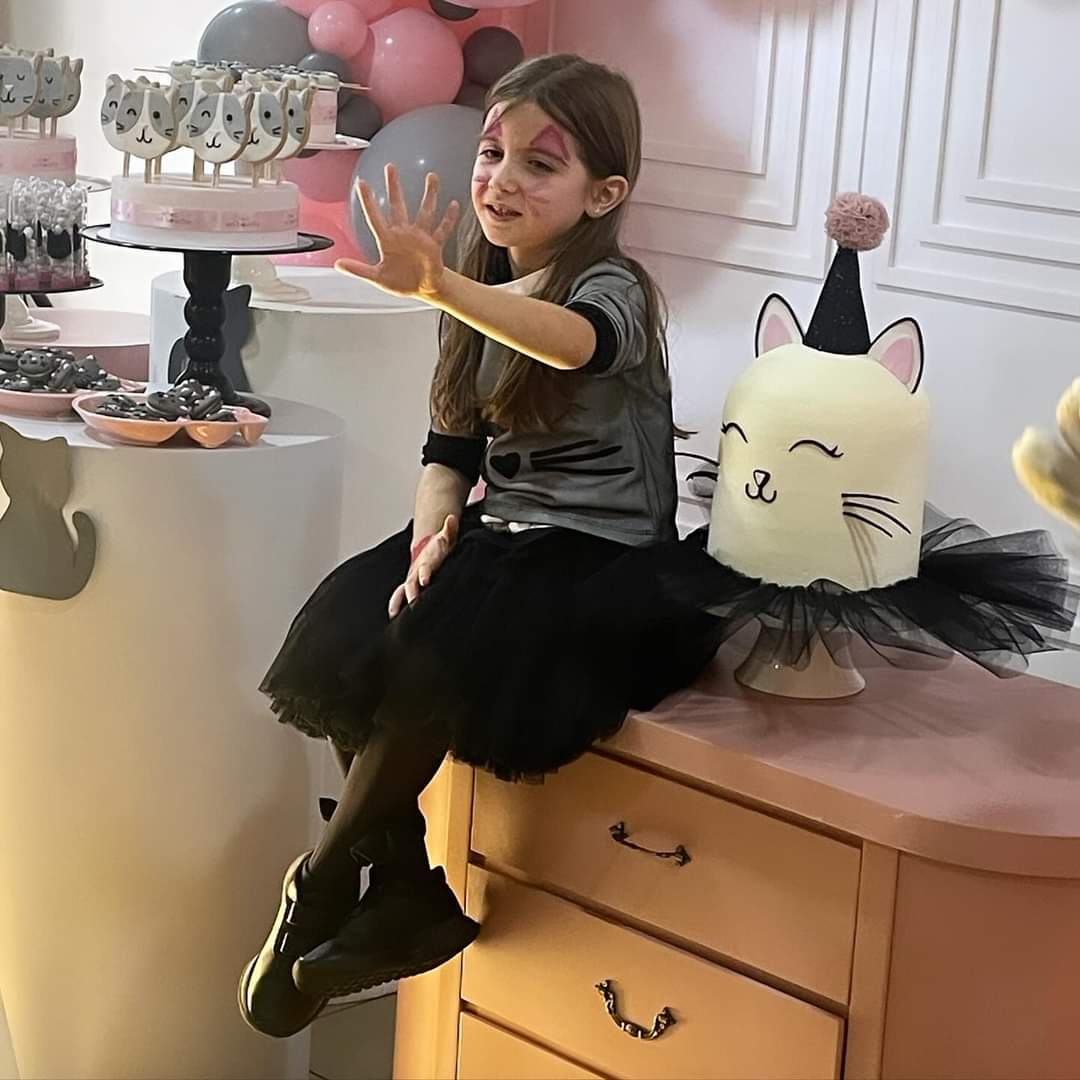 مرسوم عليها وجه قطة وتنورة من التول الأسود، وأرفقت الملابس بطوق في شعرها على شكل قطة.