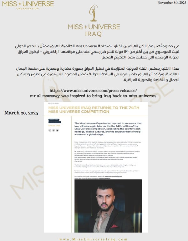 ويأتي هذا الإعلان ليعكس طموح العراق في استعادة تمثيله في المسابقة العالمية المرموقة بعد غياب طويل، مع تسليط الضوء على التراث الثقافي والجمال العراقي ونساءه الموهوبات.