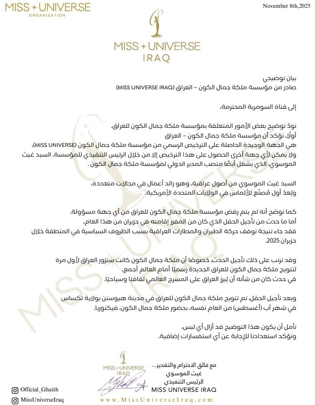 وأكد البيان أنه لم يتم رفض مؤسسة ملكة جمال الكون للعراق من أي جهة مسؤولة، وأن ما حدث من تأجيل للحفل الذي كان مقرراً في حزيران 2025 جاء نتيجة توقف حركة الطيران والمطارات العراقية بسبب الظروف السياسية في المنطقة خلال ذلك الشهر.