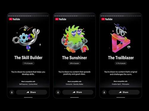 فبعد تحليل مكثف لسلوك المشاهدين، لم يرَ "يوتيوب" مجرد بيانات، بل رأى شخصيات! وقسّمها إلى أنماط مثل "المغامر" و"صانع المهارات" و"الروح المبدعة". كما صرّح "يوتيوب" عن اكتشاف مثير: أنماط الشخصية الأكثر شيوعًا كانت "المُشرق " (Sunshiner)، و"باحث العجائب " (Wonder Seeker)، و"المُوصل" (Connector)، بينما كانت شخصيات مثل "الفيلسوف" و"الحالم" هي الأكثر ندرة وغرابة.