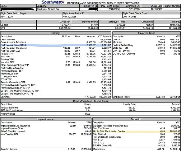 وبحسب الكشف، حقق الطيار أرباحًا أسبوعية بلغت 35,963 دولارًا عن فترة يومي 16 تشرين الثاني و1 كانون الاول، جاء الجزء الأكبر منها من 95 ساعة قضاها في قيادة الطائرة، إذ بلغ دخله 26,162 دولارًا.
