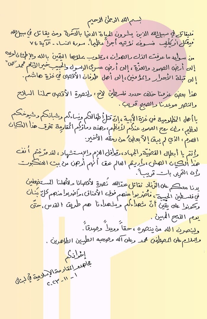 وأكمل عناصر "حزب الله" في رسالتهم: "يدنا معكم على الزّناد نقاتل عدوّ الله نصرةً لأقصانا ولأهلنا المستضعفين في فلسطين الحبيبة، فاضربوا منهم فوق الأعناق، واضربوا منهم كلَّ بنان وكونوا على يقينٍ أنّ شهداءكم وشهداءنا هم طريق