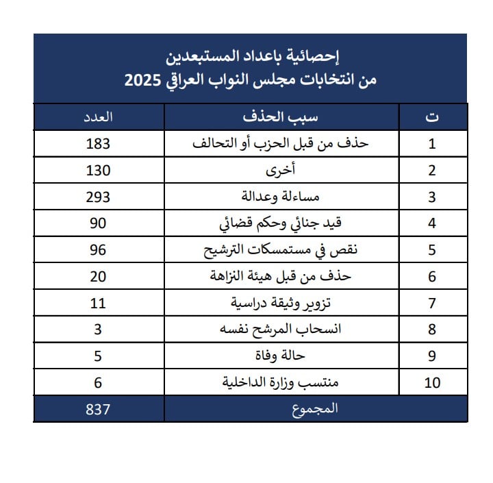 المفوضية تنشر آخر إحصائية للمستبعدين من السباق الانتخابي (وثيقة)