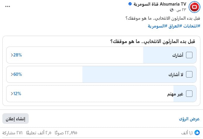 23 الف شخص شارك برأيه.. السومرية تعرض نتائج استفتائها لنسبة المشاركين والمقاطعين للانتخابات