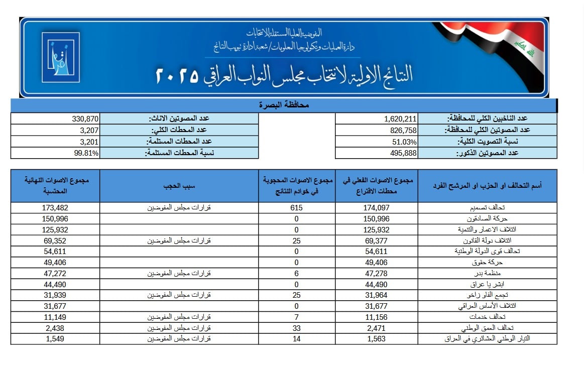 نتائج الانتخابات في البصرة: تصميم أولا صادقون ثانيا الإعمار والتنمية ثالثاً