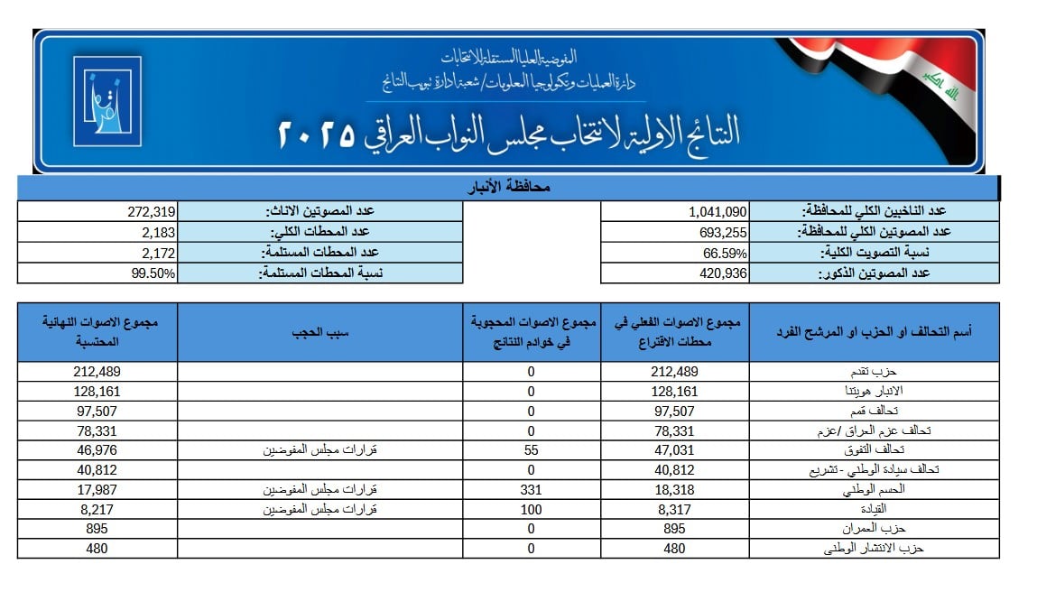 تقدم يتصدر في الانبار وحزب الانبار هويتنا ثانياً يليه قمم وعزم