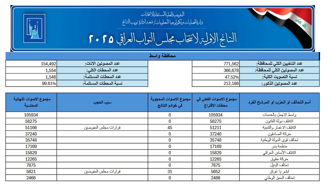 نتائج الانتخابات في واسط: واسط اجمل أولا ودولة القانون ثانيا والاعمار ثالثا
