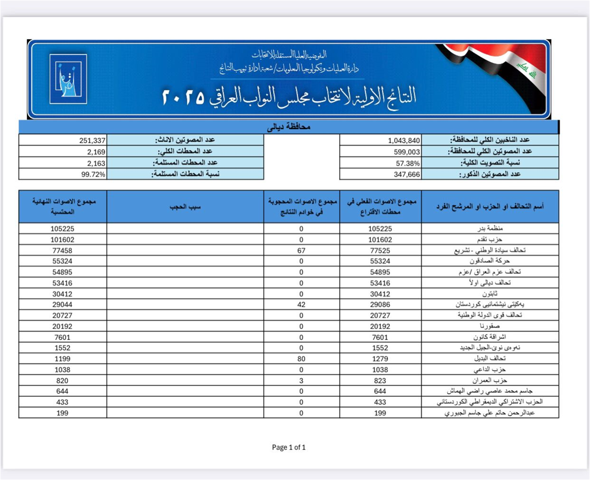 بدر تتصدر نتائج الانتخابات في ديالى ثم تقدم والسيادة