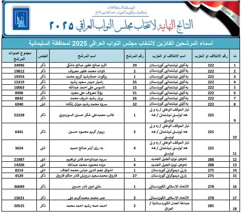 النتائج النهائية للانتخابات البرلمانية في السليمانية