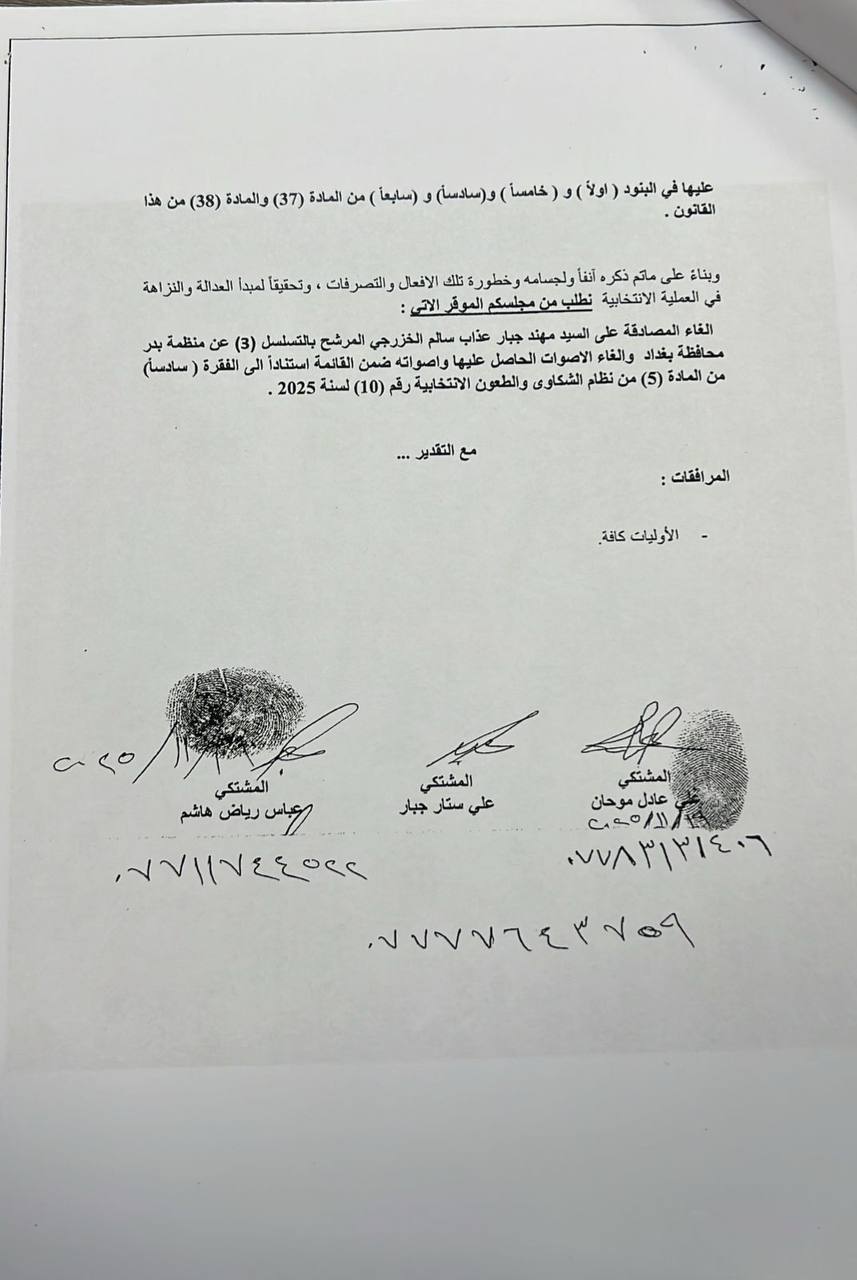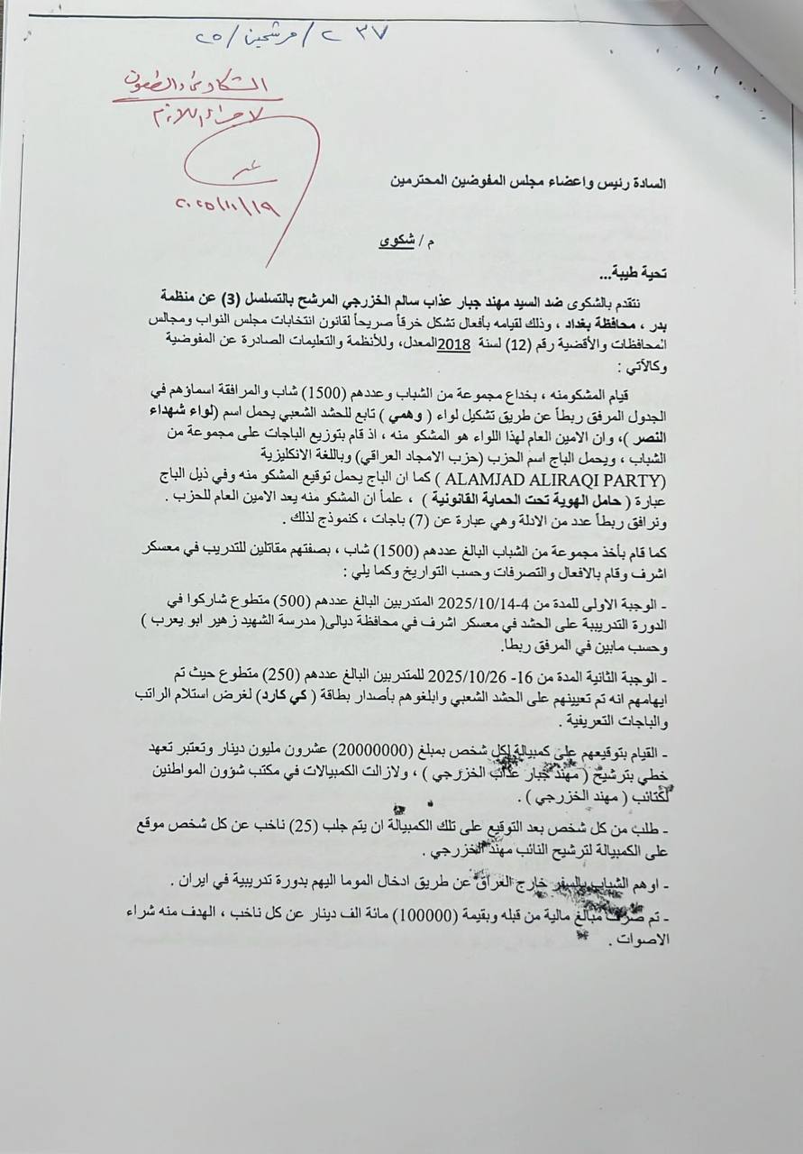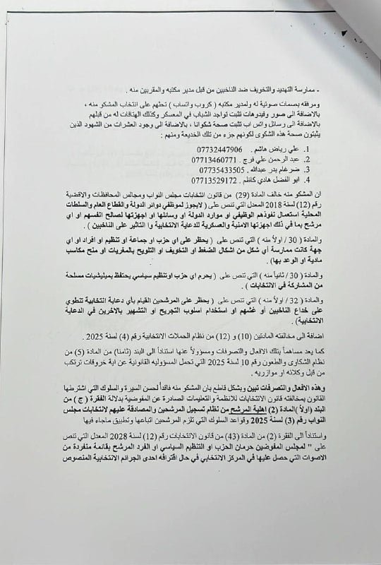 بالوثائق.. ناخبو احد المرشحين للانتخابات يقدمون شكوى للمفوضية بعد تعيينهم في لواء وهمي