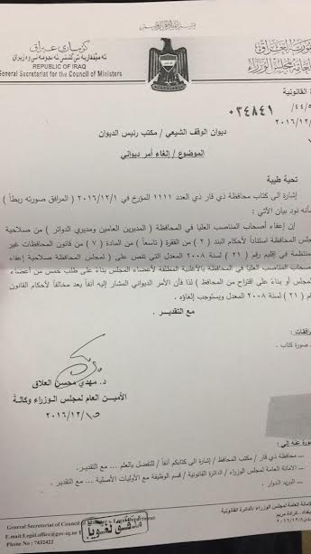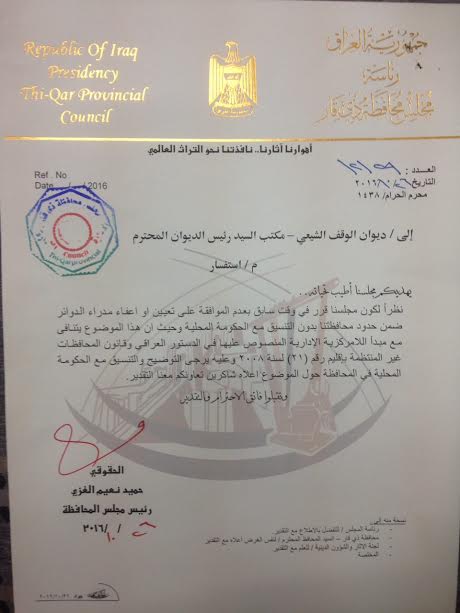 خاطب ديوان الوقف الشيعي بتاريخ ٢٦-١٠-٢٠١٦ بكتابه المرقم ١٢١٥٩ والذي أكد فيه أن المجلس قرر في وقت سابق على عدم سماحه بتعيين أو إعفاء مدراء الدوائر ضمن حدود المحافظة دون التنسيق مع الحكومة المحلية، وأكد الكتاب رفضه تعيين مدير جديد للوقف الشيعي لما يحمله هذا الامر من تعارض مع مبدأ اللامركزية".