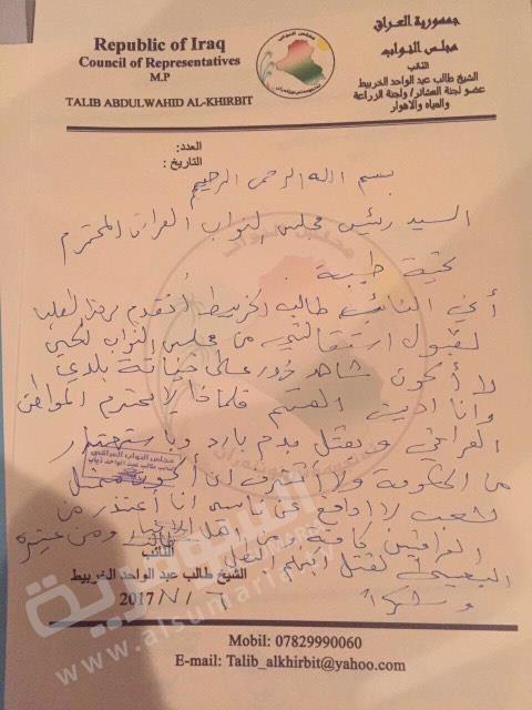، عليه "اني النائب طالب الخربيط، اتقدم بهذا الطلب لقبول استقالتي من