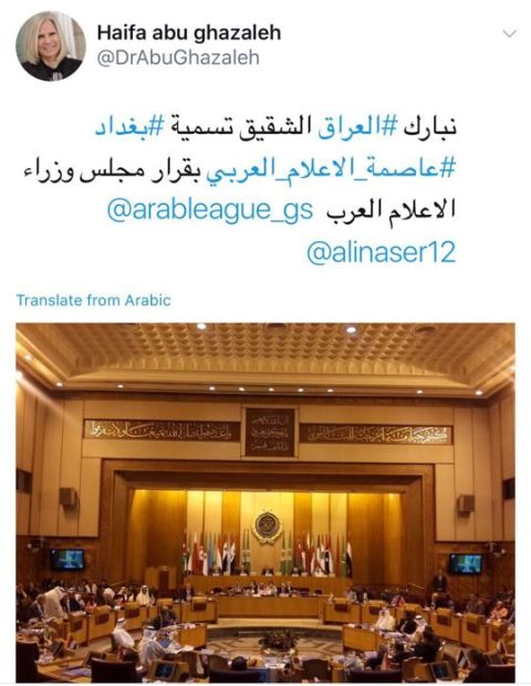 وقالت ابو غزالة في تغريدة لها على موقع تويتر "نبارك للعراق الشقيق تسمية بغداد عاصمة الاعلام العربي بقرار مجلس وزراء الاعلام العربي".