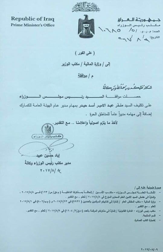 بالوثيقة.. تكليف منذر عبد الامير بمهام مدير عام الجمارك