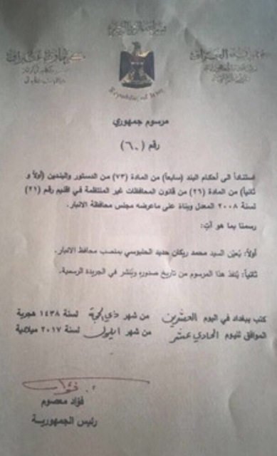 بالوثيقة.. مرسوم تعيين الحلبوسي محافظا للانبار
