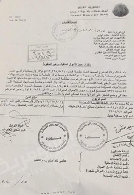 وكشف حيدر عن "وثيقة وصلت اليه تشير الى مطالبة المصرف التجاري بوضع اليد وحجز الاموال المنقولة وغير المنقولة لشركة الماس القابضة لوجود مبلغ بذمتها يتجاوز الـ 412 مليون دولار وذلك عن تسهيلات مالية سبق وان قدمت للشركة من قبل المصرف".