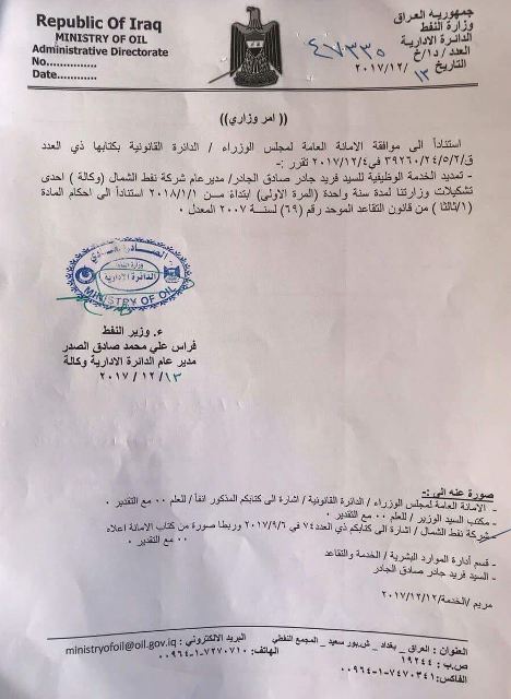 بالوثيقة...نائب يكشف عن تمديد عمل مدير نفط الشمال رغم شبهات "الفساد" عليه