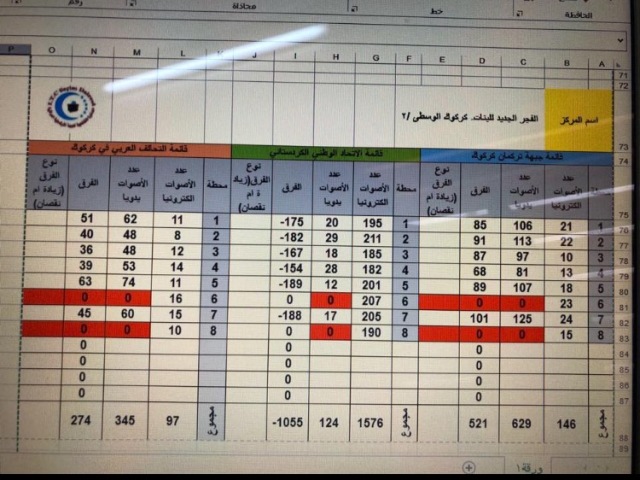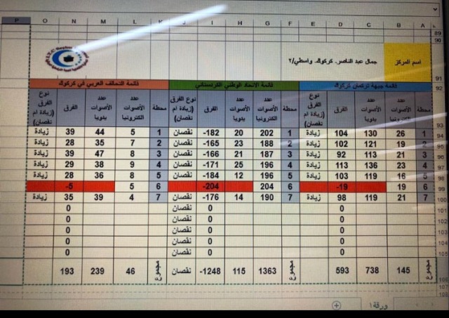 كركوك حيث حصلت القائمة على بالعد والفرز الالكتروني على ١٤٥ صوتا، وبعد اجراء العد والفرز اليدوي حصلت على ٧٣٨ بفارق ٥٩٣ صوتا".