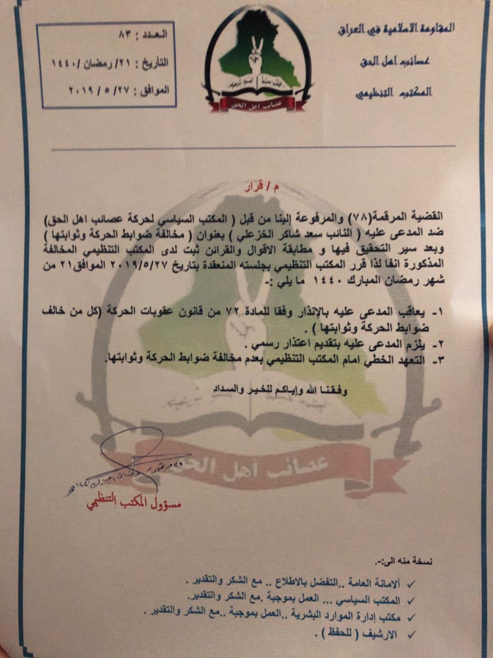 وقرر المكتب "معاقبة المدعي عليه بالانذار وفقا للمادة 72 من قانون عقوبات الحركة (كل من خالف ضوابط الحركة وثوابتها)، كما تقرر ان يلزم المدعي عليه بتقديم اعتذار رسمي، اضافة الى تقديم تعهد خطي امام المكتب التنظيمي بعدم مخالفة ضوابط الحركة وثوابتها".