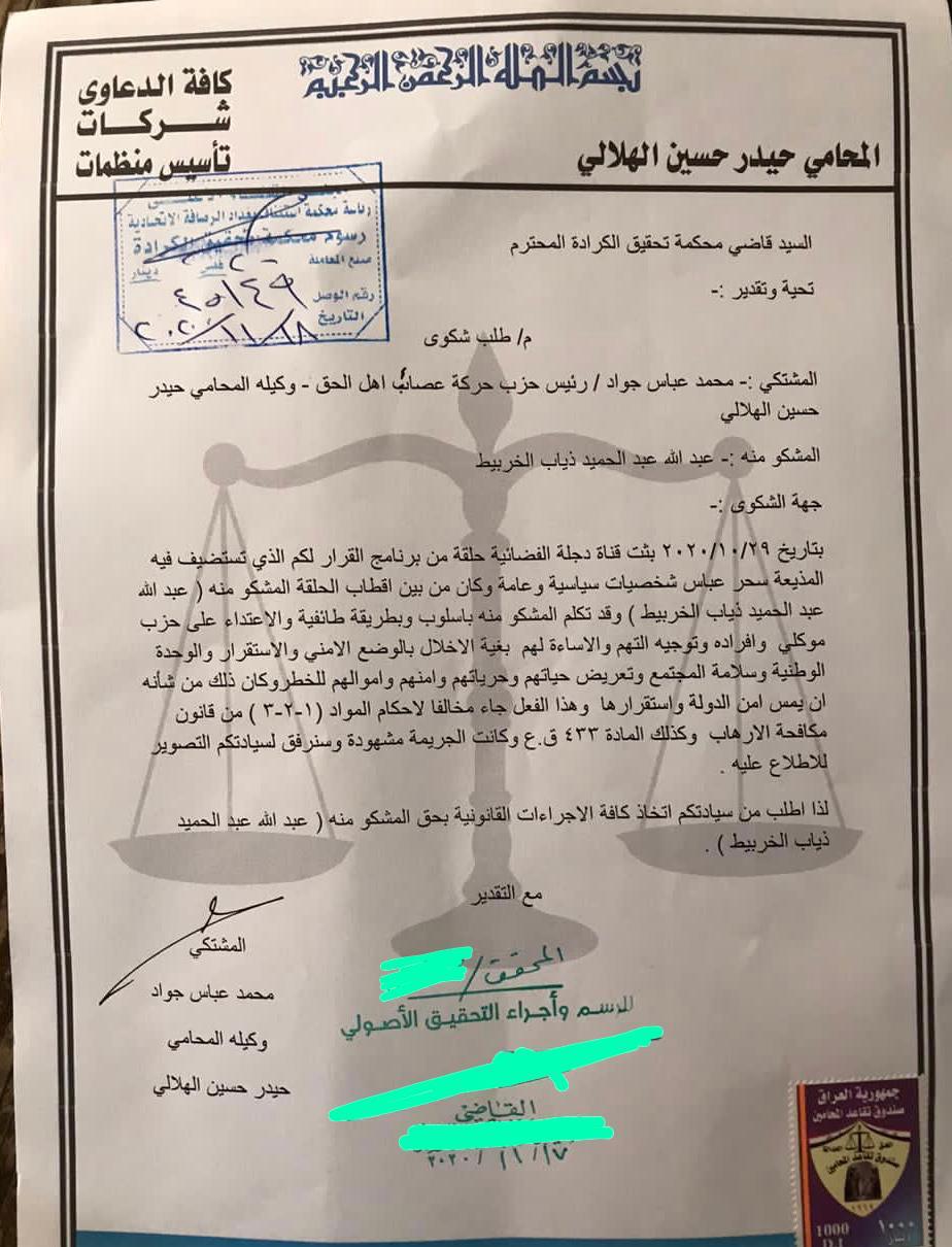 ، بالوثيقة، قيام حركة عصائب اهل الحق برفع دعوى قضائية ضد النائب