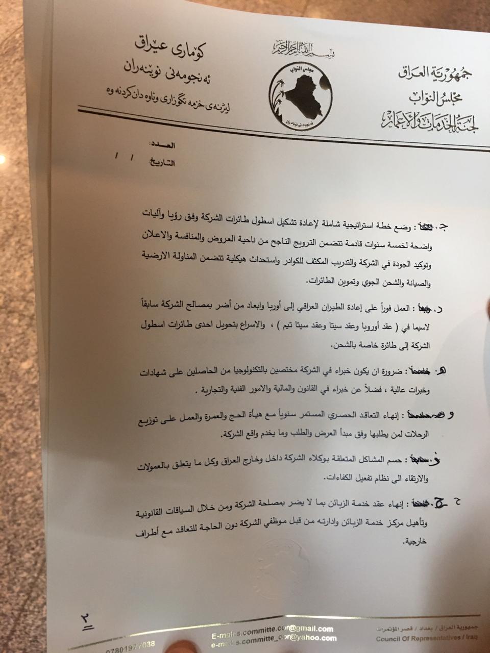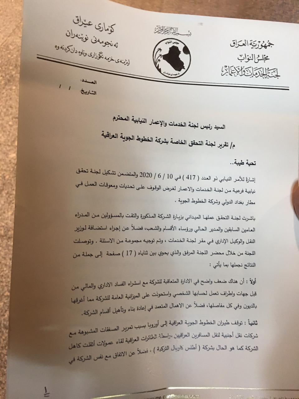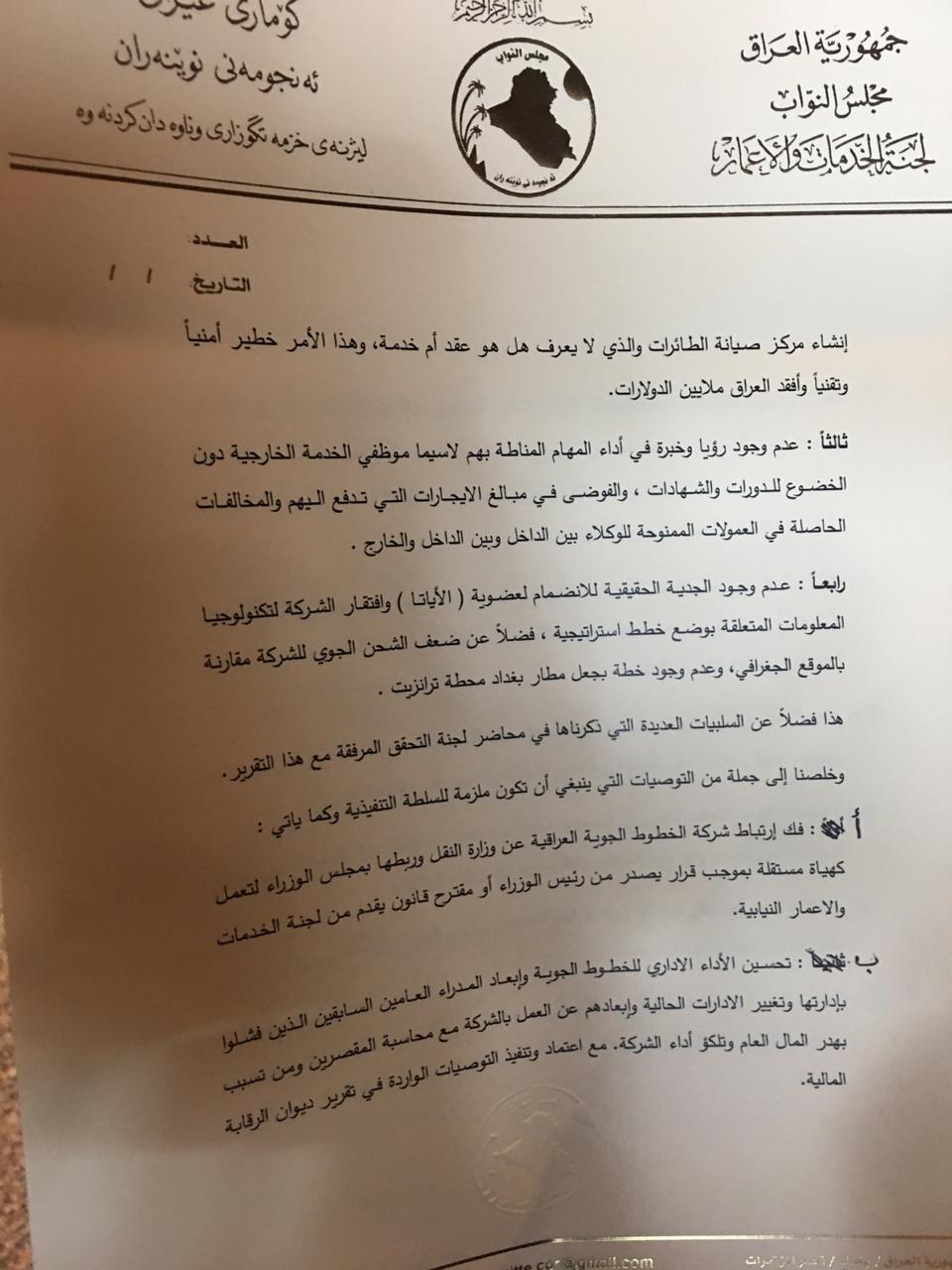 بالوثائق.. تقرير لجنة التحقق البرلمانية بشركة الخطوط الجوية العراقية